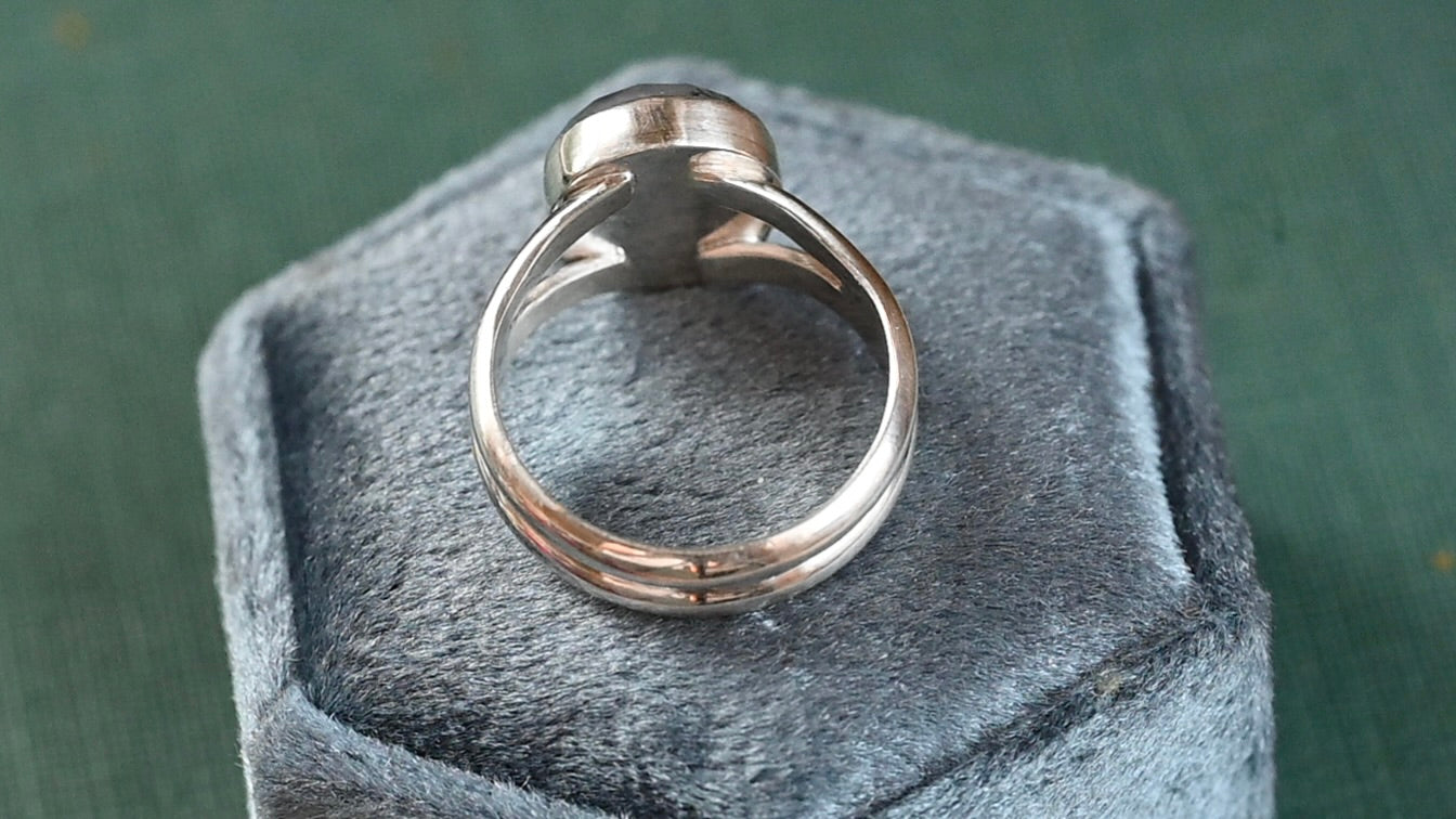 Each of these rings holds a totally unique stone with its own pattern of dendrites over a milky white background. The surface is faceted and sparkly.