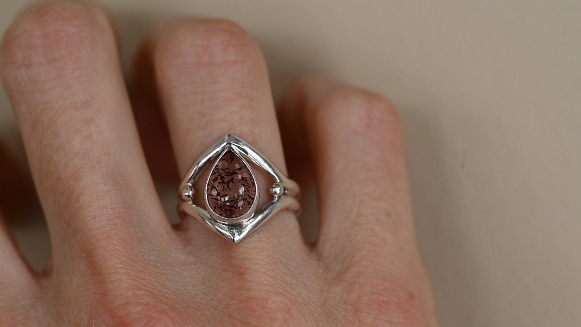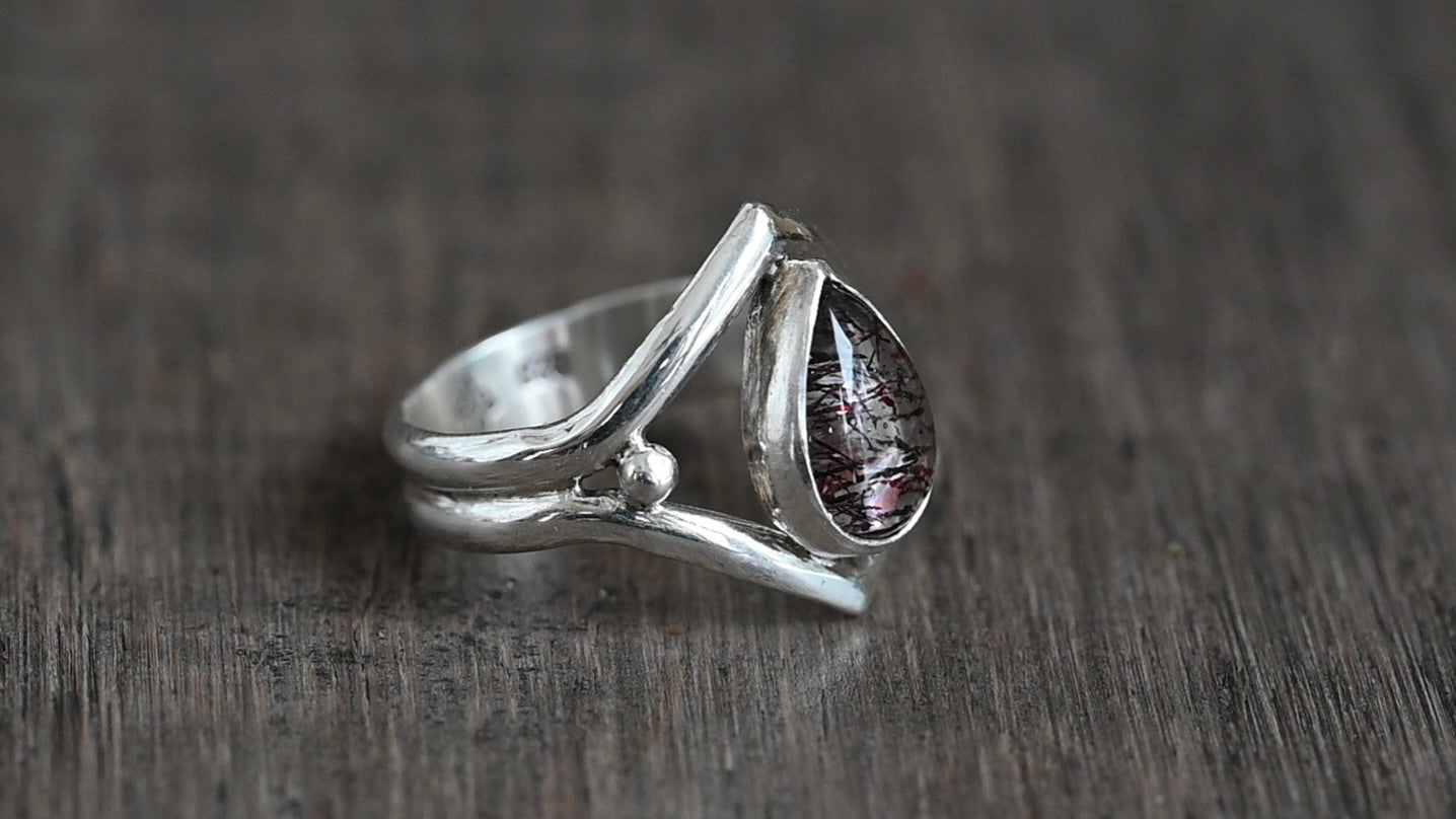 This ring features a unique quartz specimens with dark red iron oxide filaments inside. Other than the red filaments, the stone is quite clear and it comes in an open setting so you can see through it. The stone is nestled between two pointed ring bands.